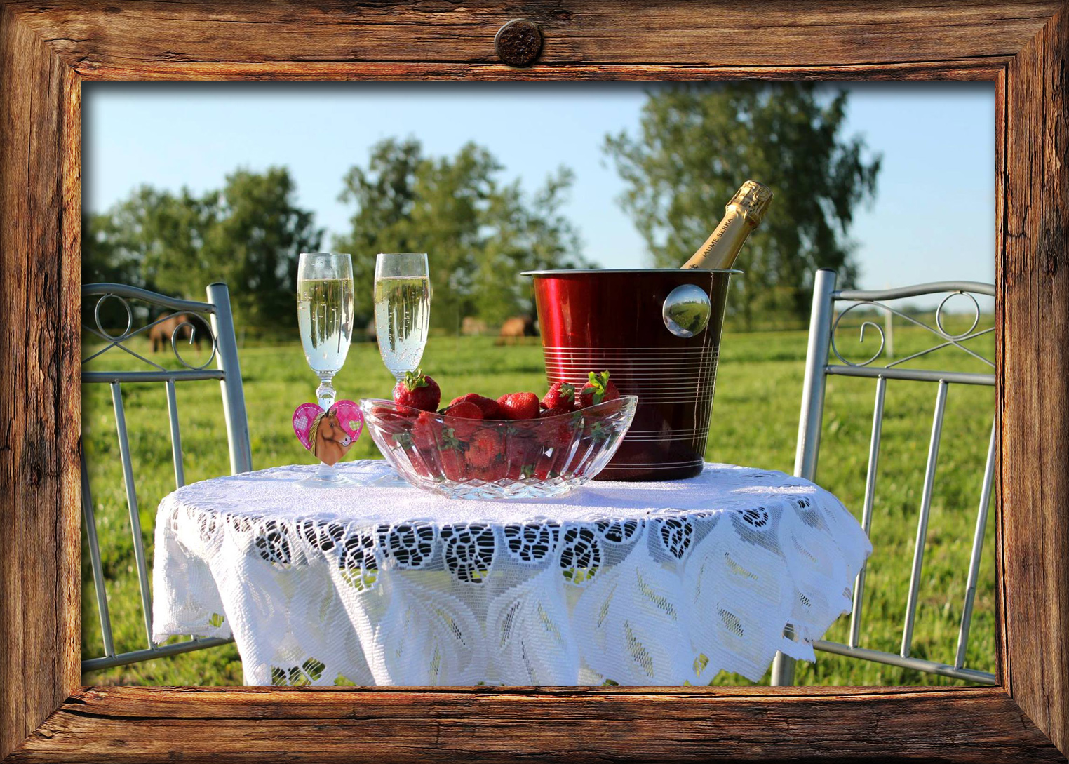 Предложение включает столик с шампанским и клубникой, фотосессию на двух лошадях.