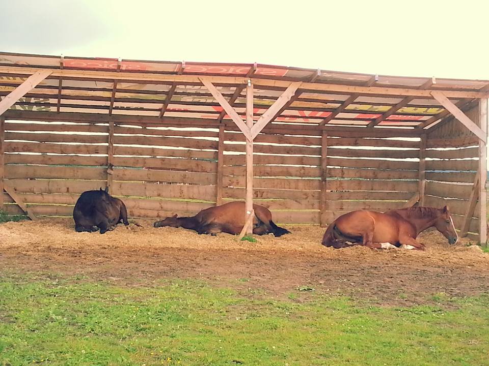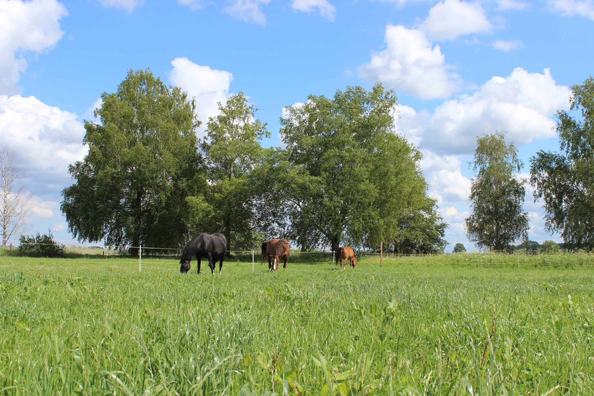 Просторные левады для выпаса лошадей предлагаются круглый год. В левадах лошади делятся на небольшие группы в соответствии с характером и совместимостью, чтобы свести к минимуму потенциальный риск травм. Летом предлагаются просторные луга, которые окружены рекой Медайне. Всем лошадям в левадах доступны комфортабельные навесы, где при необходимости можно спрятаться во время неблагоприятных погодных условиий. Как и в боксах, так и в левадах лошадям доступна гималайская соль и свежая питьевая вода. И в зависимости от сезона, кормушки с сеном.